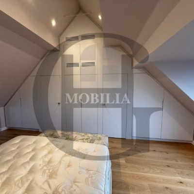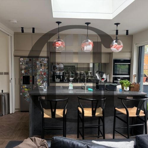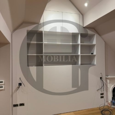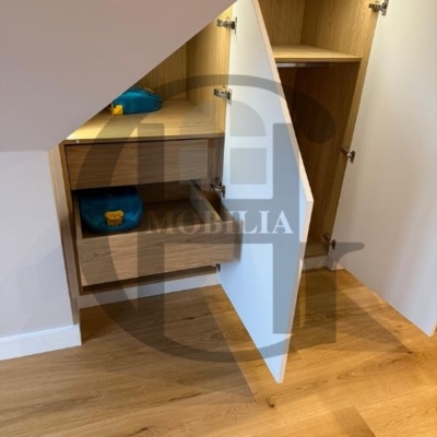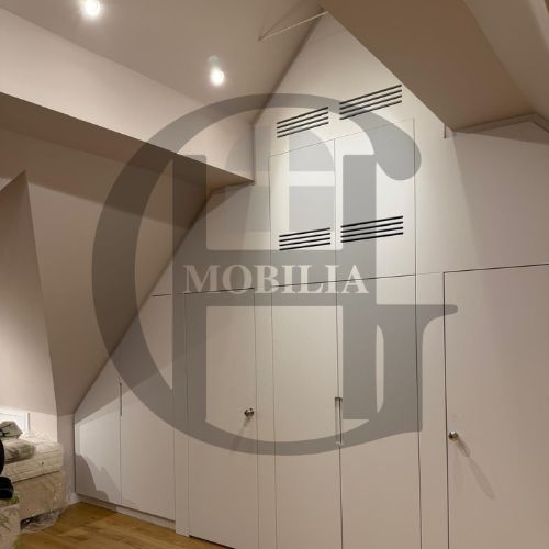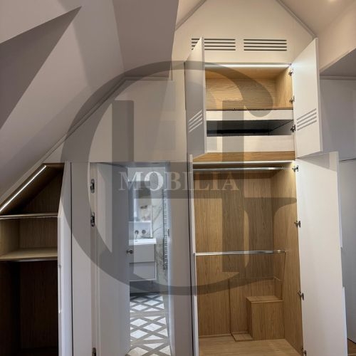 Custom-built loft with sleek wardrobes, smart shelving, and a modern kitchen. Designed to maximise space under sloped ceilings with elegant, minimalist finishes throughout for a seamless and functional living experience.